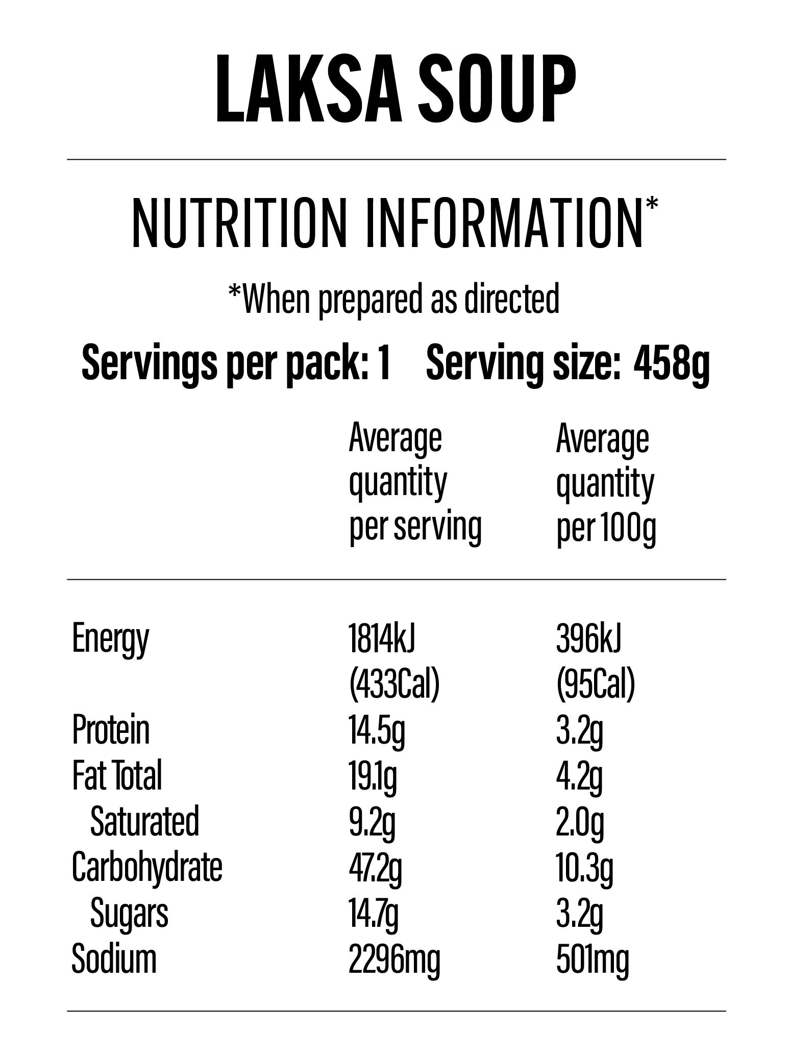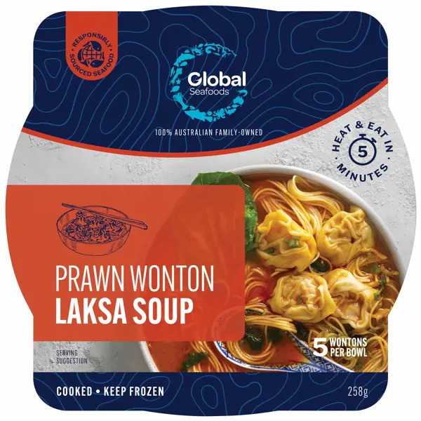 Soup (43%)(Laksa Paste (Spices, (Chilli, Shallot, Lemongrass, Garlic, Galangal, Turmeric, Ginger, Paprika, Onion), Sugar, Soybean Oil, Shrimp Paste (contains Crustacean), Salt, Dried Shrimp (Crustacean), Creamed Coconut, Fish Sauce (contains Fish), Garam Masala, Flavour Enhancer: Disodium-5-ribonucleotides (635), Colour (160c)), Water, Coconut Milk (Coconut Meat, Water, Emulsifier (435)), Vegetables (Chinese Cabbage, Coriander, Fried Shallot (contains Soy)), Yeast Extract, Potato Starch), Noodles (30%) (Wheat Flour, Water, Salt, Rice Bran Oil, Tapioca Starch), Prawn Wontons (27%) (Prawns (10%) (Litopenaeus vannamei) (Crustacean), Water, Wheat Flour, Tapioca Starch, Sesame Oil, Egg, Acidity Regulators (450, 451, 452, 331, 500), Salt, Potato Starch, Yeast Extract, White Pepper