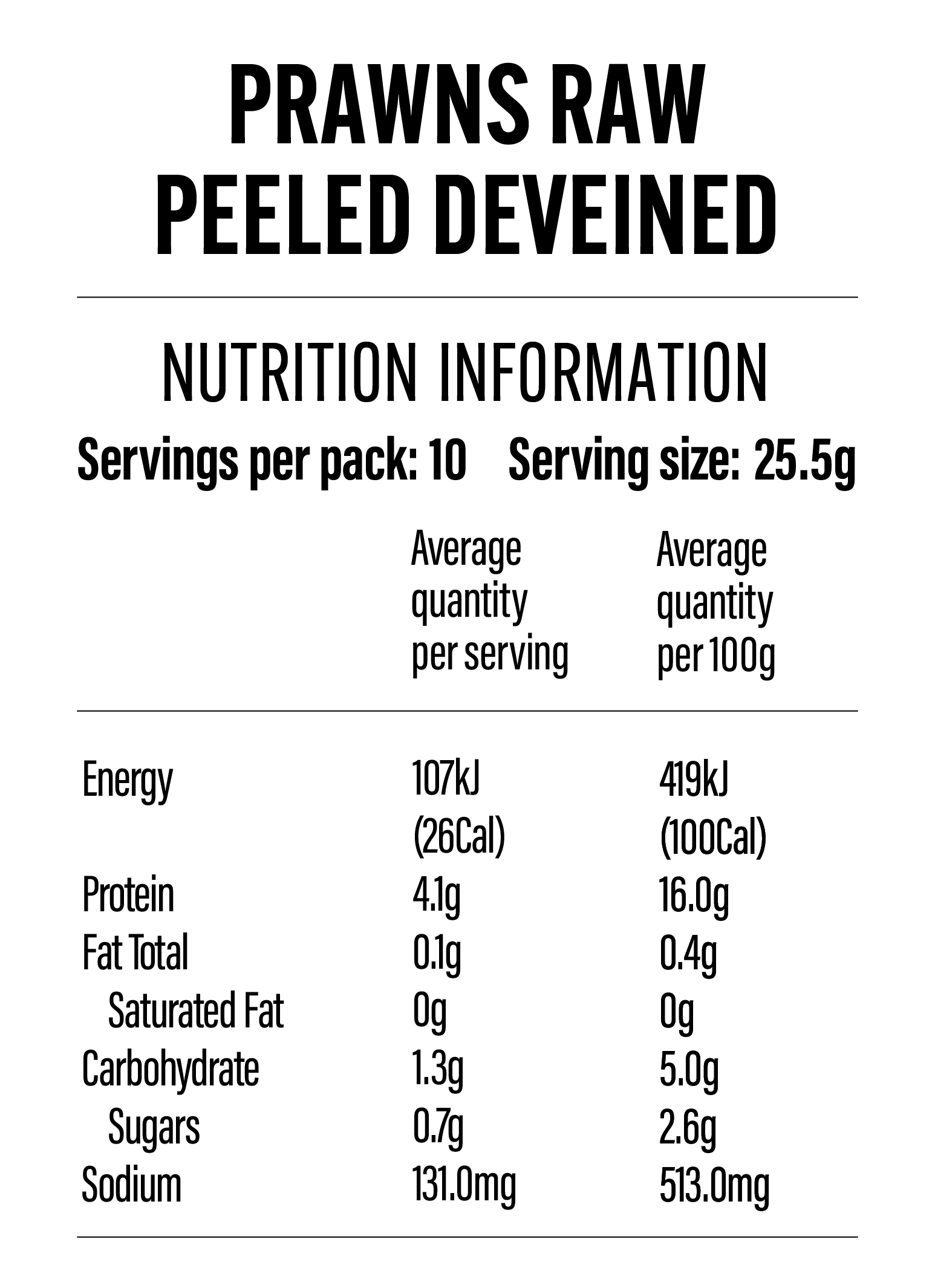 Prawn (99%) (Litopenaeus vannamei) (Crustacean), Water, Salt, Acidity Regulators (451, 452).